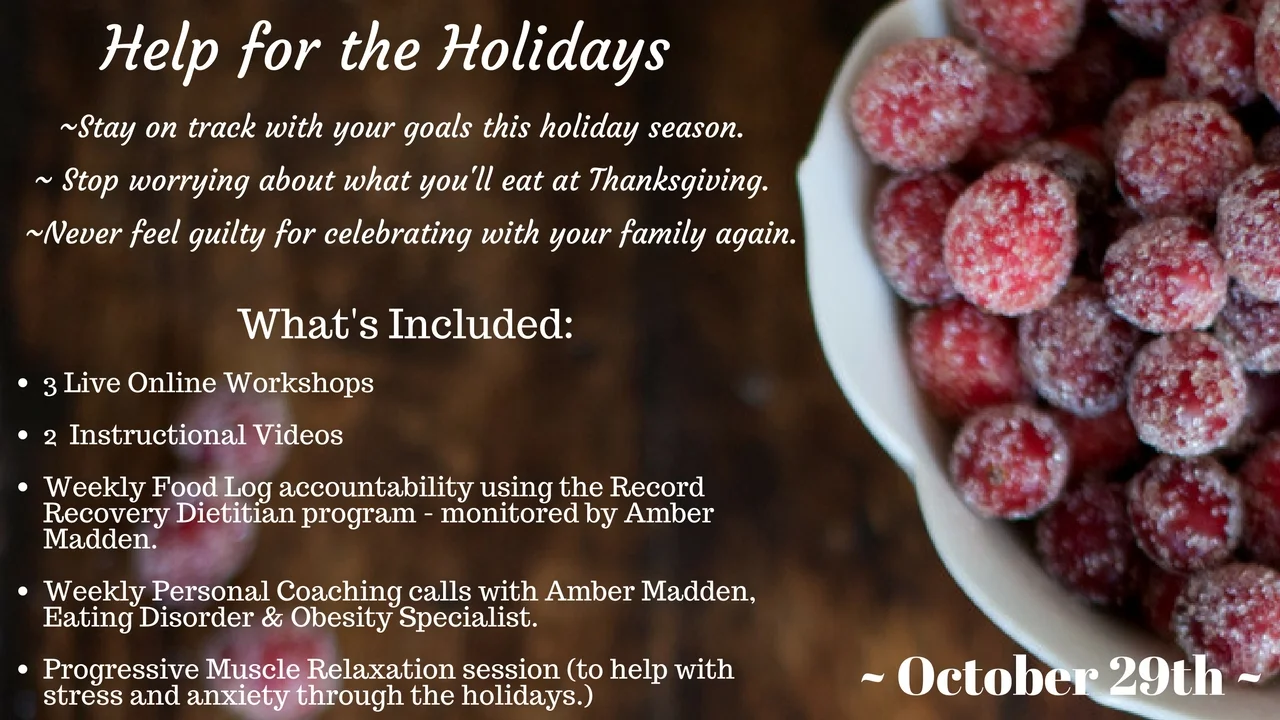 In the Happy Healthy Holidays Support Group we will be addressing ALL of these issues and more. If you're the person that has made progress towards goals and you're TERRIFIED you might relapse during the holidays -- then this group is for YOU. If you're wondering how you can possibly enjoy food, when you constantly feel like food is the enemy -- then this group is for YOU. If you find that you are constantly stressed to the max during the holidays, which in turn, leads to eating ALL the holiday cookies -- then this program is for you.
